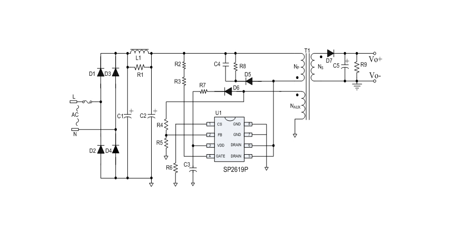 SP2619P 是一款性能優(yōu)異的原邊反饋控制電路,應用于小功率 AC/DC 充電器與適配器。控制電路使用原邊采樣技術進行精確的恒流、恒壓控制,可以省去一般應用中的光耦與 TL431。