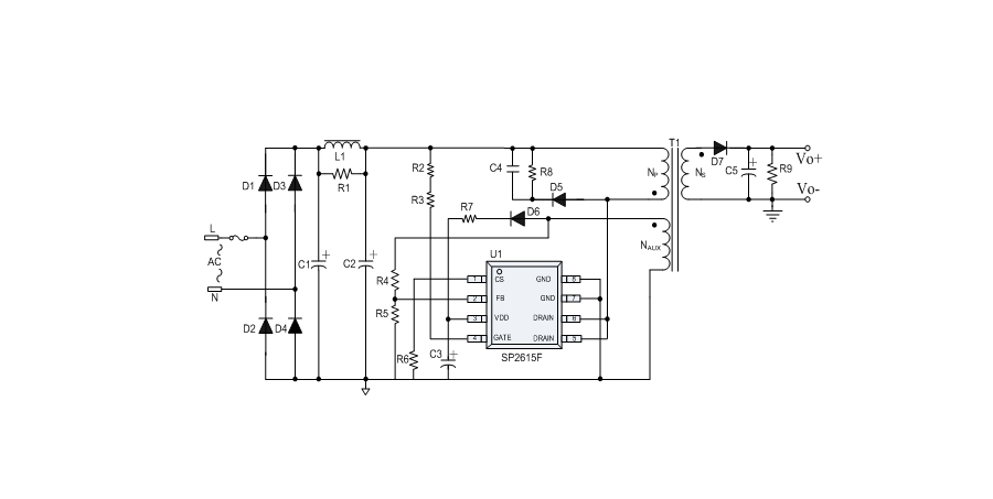 SP2615F提供全面的保護功能,包括逐周期限流保護(OCP)、VDD過壓保護(OVP)、VDD欠壓保護(UVLO)、反饋環(huán)路開路保護、輸出短路保護、輸出過壓保護、過溫保護等。其中,輸出短路保護、輸出過壓保護具有自動重啟恢復的功能。