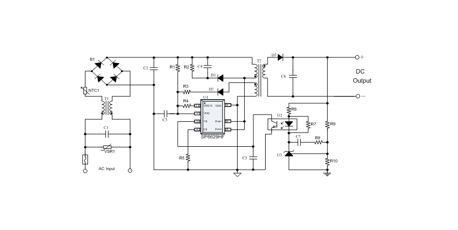 SP6629HF在PWM模式下工作于固定頻率,這個頻率是由內部精確設定的。在空載或者輕載時,工作頻率由IC內部調整。芯片可以工作在綠色模式,以此來減小輕載時的損耗,提高整機的工作效率,SP6629HF在啟動和工作時只需要很小的電流,可以在啟動電路中使用一個很大的電阻,以此來進一步減小待機時的功耗。芯片內置有斜坡補償電路,當電路工作于大占空比時,避免次諧波振蕩的發生,改善系統的穩定性。內置有前沿消隱時(Leading-edge blanking time),消除緩沖網絡中的二極管反向恢復電流對電路的影響。SP6629HF采用了抖頻技術,能夠有效改善系統的EMI性能。系統的跳頻頻率設置在音頻(20KHz)以上,在工作時可以避免系統產生噪音。SP6629HF內置多種保護,包括逐周期限流保護(OCP),過載保護(OLP),過壓保護(OVP),VDD過壓箝位,欠壓保護(UVLO),過溫保護(OTP)等,通過內部的圖騰柱驅動結構可以更好的改善系統的EMI特性和開關的軟啟動控制。SP6629HF使用SOP7無鉛封裝。