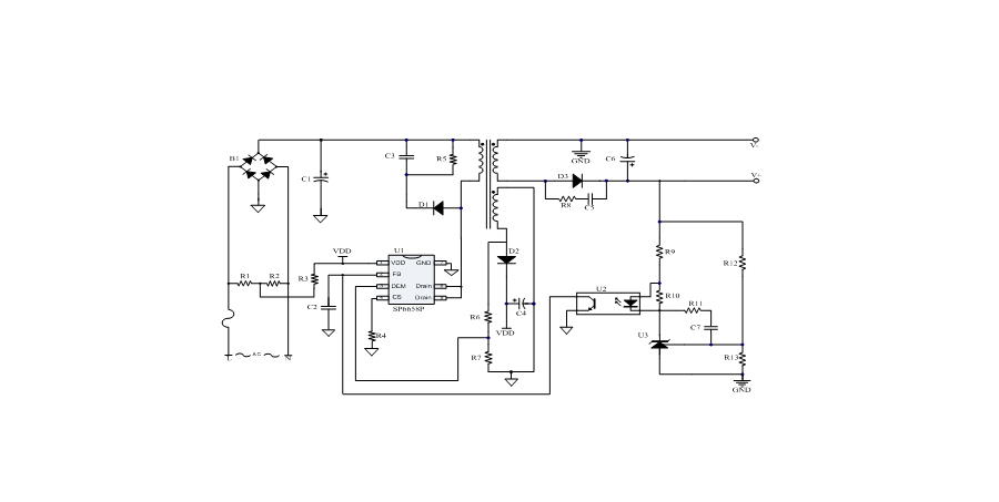 SP6658P是一顆高性能、多工作模式的PWM控制芯片。芯片可以工作在跳頻及綠色模式,以此來(lái)減小空載和輕載時(shí)的損耗,也可以工作在QR工作模式及CCM工作模式,提高整機(jī)的工作效率。SP6658P在啟動(dòng)和工作時(shí)只需要很小的電流,可以在啟動(dòng)電路中使用一個(gè)很大的電阻,以此來(lái)進(jìn)一步減小待機(jī)時(shí)的功耗。SP6658P內(nèi)置多種保護(hù),包括:輸入電壓過(guò)低保護(hù)(Brown-out),輸出電壓短路保護(hù),VDD過(guò)壓保護(hù)(OVP),VDD過(guò)壓箝位,VDD欠壓保護(hù)(UVLO),過(guò)溫保護(hù)(OTP)等。