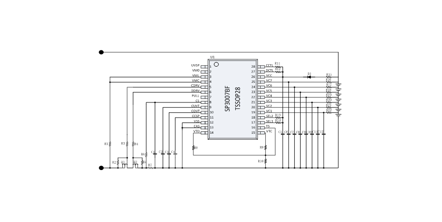 此外,SP3007BF 內置級聯控制引腳 CCTL 和DCTL,支持 2 顆及多顆級聯應用,保護更高串數的電池系統,且具有級聯的休眠模式和專用的短路啟動模式。SP3007BF 具有極低的電流消耗,正常工作時其工作電流小于 36μA,而鋰電池欠壓保護進入休眠模式后,其消耗電流小于 1μA。