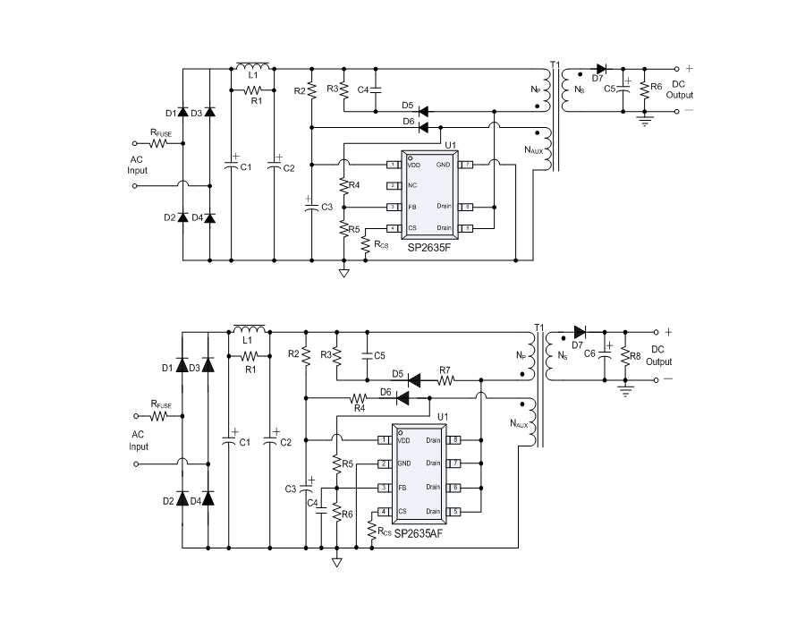 SP2635F是一款性能優(yōu)異的原邊反饋控制電路,應(yīng)用于小功率AC/DC充電器與適配器。控制電路使用原邊采樣技術(shù)進(jìn)行精確的恒流、恒壓控制,可以省去一般應(yīng)用中的光耦與TL431。