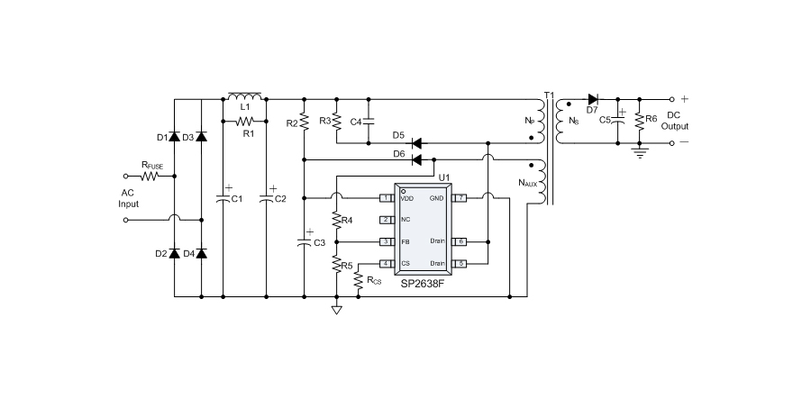SP2638F 是一款性能優(yōu)異的原邊反饋控制電路,應(yīng)用于小功率 AC/DC 充電器與適配器。控制電路使用原邊采樣技術(shù)進行精確的恒流、恒壓控制,可以省去一般應(yīng)用中的光耦與 TL431。